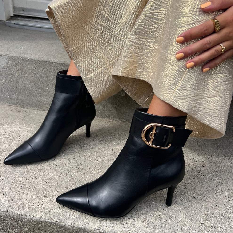 Kort skolett i sort skinn med gulldetaljer. Spiss tå og en hæl på 7,5 cm. Glidelås på innsiden. Skafthøyde 20 cm målt bak på størrelse 37. Normal til stor på størrelse.